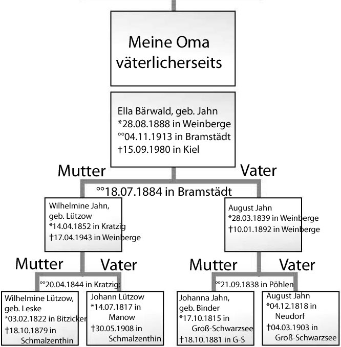 Meine Oma wurde am 28.08.1888 in Weinberge, Kreis Neustettin geboren. Ihre Kindheit verbrachte sie am idyllisch gelegenen Kämmerer See. Am 04.11.1913 heiratete sie den Landwirt Hermann Bärwald und zog zu ihm auf dessen Hof in Schmalzenthin, Kreis Neustettin.