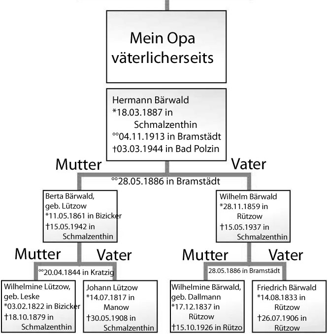 Mein Vater erzählte mir, dass mein Opa Landwirt auf einem Hof mit 8 Morgen Land gewesen war. 8 Morgen sind 2 Hektar oder 20.000 Quadratmeter. Anfallende Reparaturen im Hof und der Landwirtschaft führte er selbst mit großer Geschicklichkeit aus. Diesen Bärwald-Hof in Schmalzenthin hatte in den Jahren 1865 und 1870 sein (meines Vaters) Urgroßvater Johann Lützow und seine Frau Wilhelmine, geb. Leske, vom Vorbesitzer Dröse käuflich erworben.